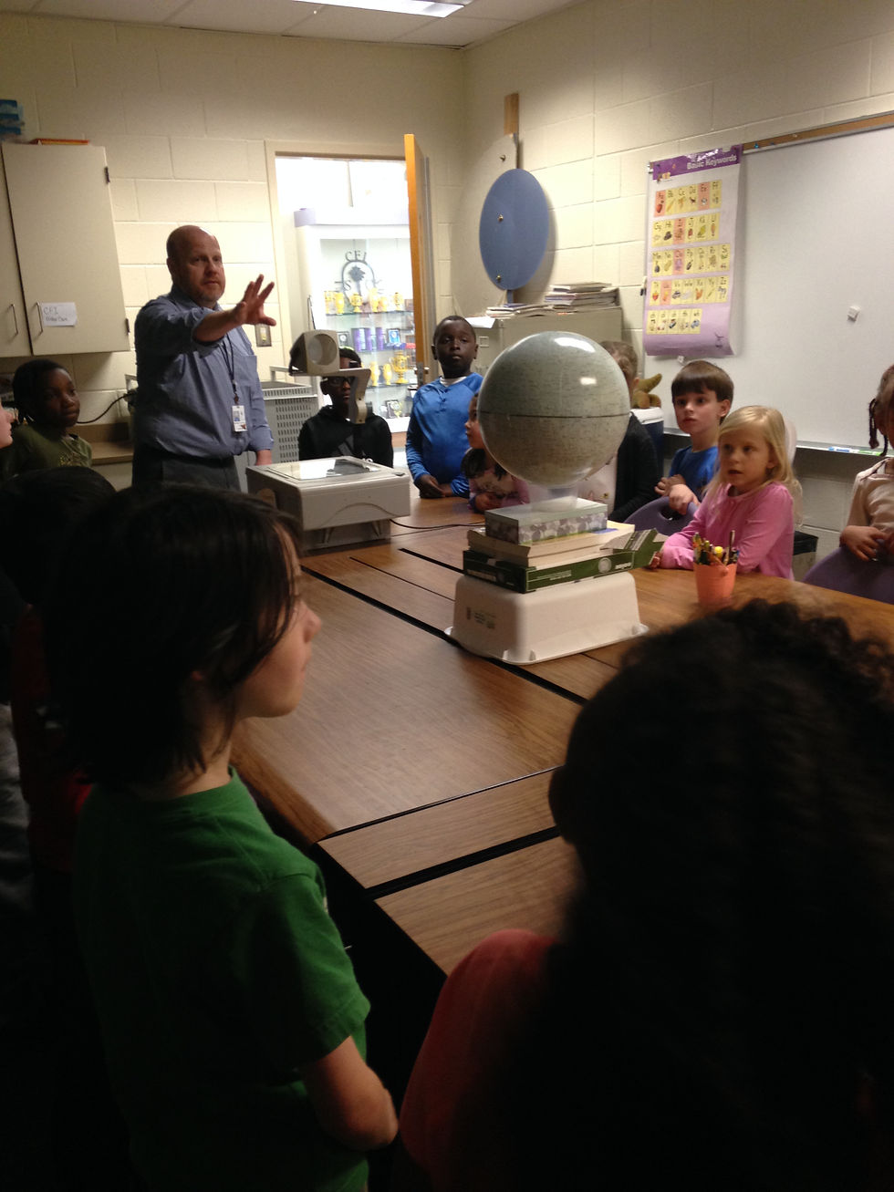 On Monday we had Mr. Ed Emmer from the science instruction department at the district come and provide a demonstration to both first grade classes. He showed us how we see the moon seem to change based on how much light from the sun illuminates it as it revolves around us. Here we are walking around the moon and watching the amount lit up change.